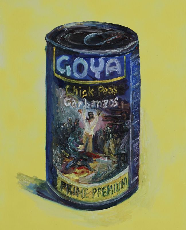 Painting of a famous Goya painting on a can of Goya beans. Oil and spray paint on can.
